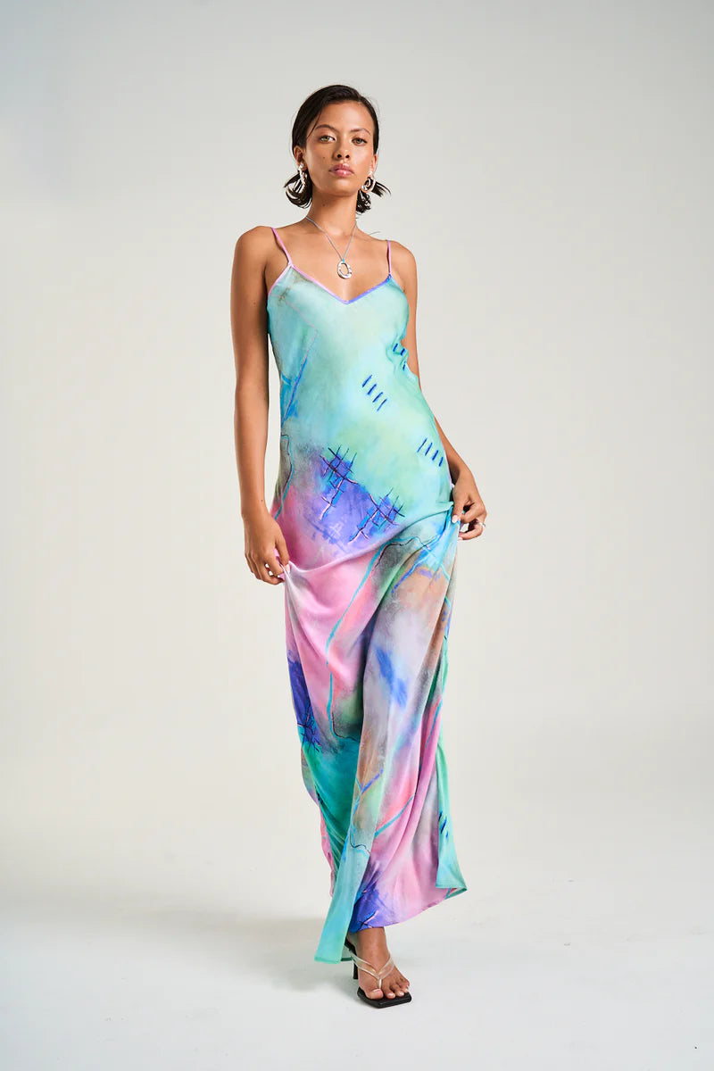 The Siren Dress showcasing the hand-pained abstract artwork H2O is a classic and flattering full length maxi dress with a v-neck and adjustable straps.
